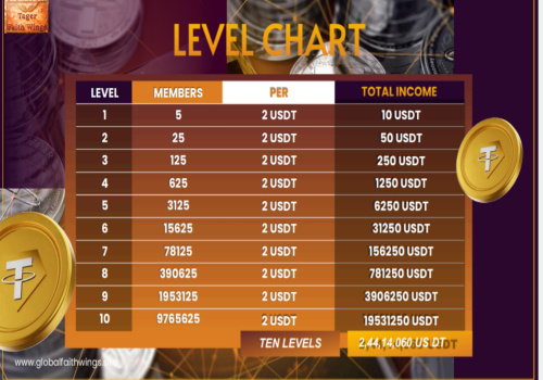 Tager Faith Wings offers no "Position Bonus." Income is level-based: 2 USDT (Standard) or 8 USDT (Auto-Fill) per member across 10 levels. 5 members required for Level 1. 20% admin fee applies.